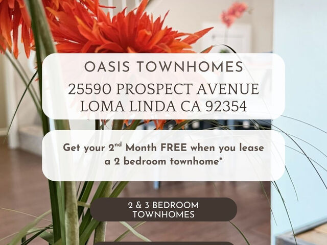 For those who enjoy the complete lifestyle, why not go about your busy day and come home to your own personal sanctuary? Designed, approved, and built as a condominium complex with the lowest density in the Inland Empire (less than 14 units to an acre whereas most apartment-style projects have 22-28 units per acre), Oasis is within walking distance of the acclaimed Loma Linda Medical Center. Oasis Townhomes Apartments offers a relaxing, resort-style atmosphere to help balance the demands of everyday life.